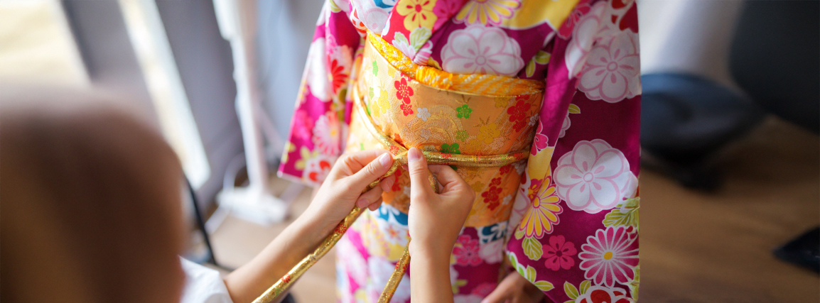 専門スタッフがスピーディにお着付け。帯アレンジも承ります。